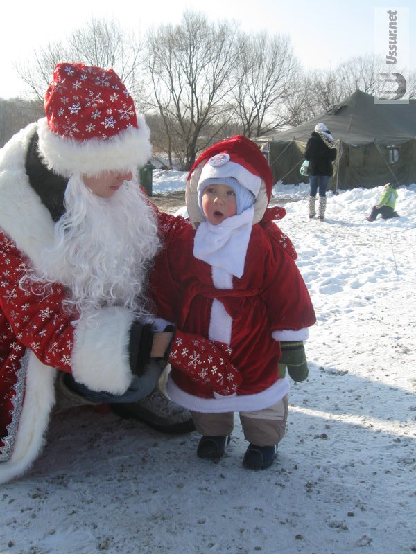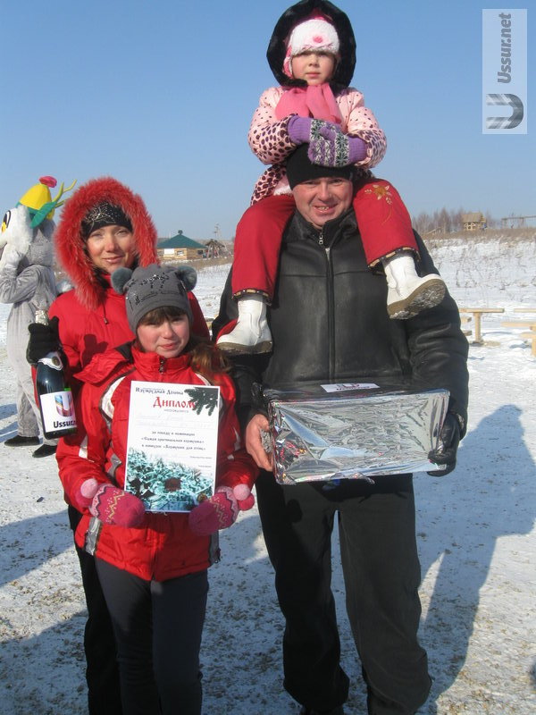 Ну и конечно же. Ussur.net выступил в роли спонсора в номинации «Самая креативная кормушка». Победителем в этой номинации стал Денис Ситников. Смастерить кормушку Денису Геннадьевичу помогала вся семья: жена Виктория и дочери Мария и Аня. В подарок от Ussur.net семья Ситниковых получила бутылку "фирменного" шампанского и 10 кг самых новогодних фруктов. =)